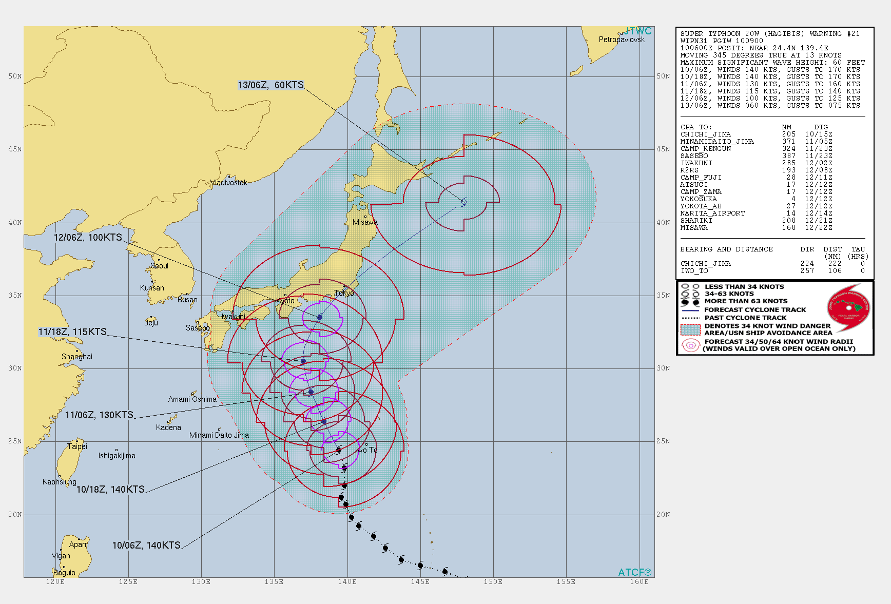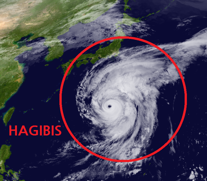 태풍 하기비스의 위성 영상을 보면 매우 뚜렷한 눈과 운정 온도(雲頂溫度) 영하 70도 이하의 두꺼운 대류역을 볼 수 있다. 게다가 일본 기상청(JMA)의 크기 분류에 따르면 영향 범위가 직경 1400km에 이르는 '대형 태풍'이기도 하다. 현재 태풍은 도쿄 남쪽 약 1200km 부근 해상까지 접근했으며, 예보대로라면 이번 주말(10월 12일 오후)에 일본 시즈오카 현 이즈 반도~도쿄 인근 범위에 상륙할 것으로 보인다.