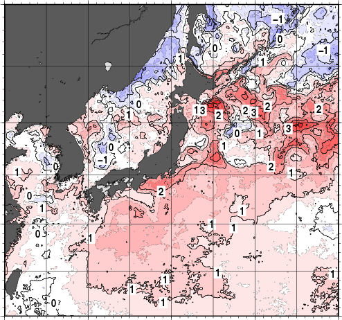 해수면 온도 분포를 보면, 강했던 고기압으로 인해 도쿄 남해상에는 평년보다 2도 가량 높은 해수온이 형성되었다. 10월 중순이라는 비교적 늦은 시기에도 불구하고, 이러한 높은 해수역이 '슈퍼 태풍' 하기비스의 세력 약화를 늦추는 데에 기여할 듯하다.