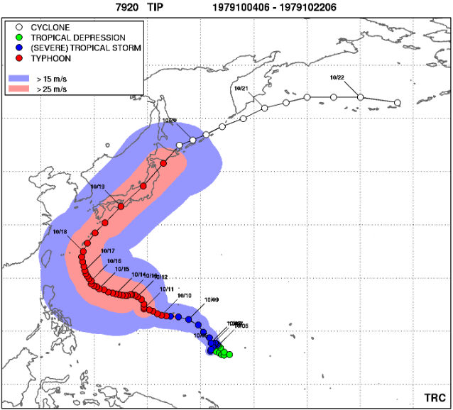 관측 역사상 최강의 태풍으로 알려진 1979년 20호 태풍 팁(TIP)은 '중심기압 870hPa'의 경이적인 위력과 '초대형'의 규모를 갖춘 채, 하기비스와 비슷한 시기(10월 중순)에 일본 본토로 북상했었다. 원래 10월 중순은 겨울로의 계절 변화와 함께 대륙 고기압의 잦은 남하 때문에 동북아시아 일대에서 열대성 저기압이 세력을 유지하기가 어렵고, '팁' 역시 낮은 수온과 건조 공기 등으로 인해 일본 상륙 시에는 중심기압 965hPa까지 약화된 바 있다.