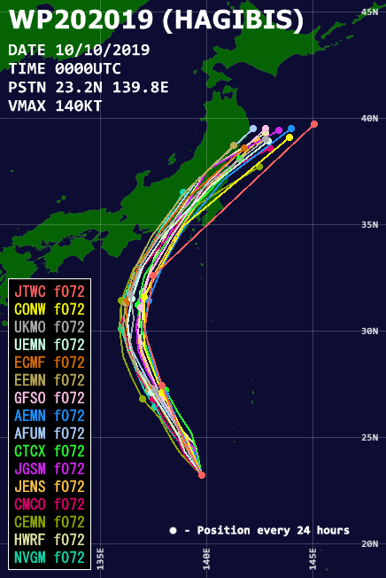첨부한 주요 수치 모델의 경로도를 보면 대부분의 멤버가 하기비스에 대해 도쿄 서쪽 통과를 예측하고 있지만, 미국 합동태풍경보센터(JTWC)는 가장 동쪽으로의 진로를 예측했다. 이는 도쿄만으로 진출했던 9월의 파사이와 유사한 경로다. 파사이는 한때 도쿄 서쪽 통과가 예상되었다가 최종적으로는 동쪽으로 치우쳤으므로, 하기비스 또한 정확한 상륙 지점은 당일(10월 12일)에나 알 수 있을 전망이다.