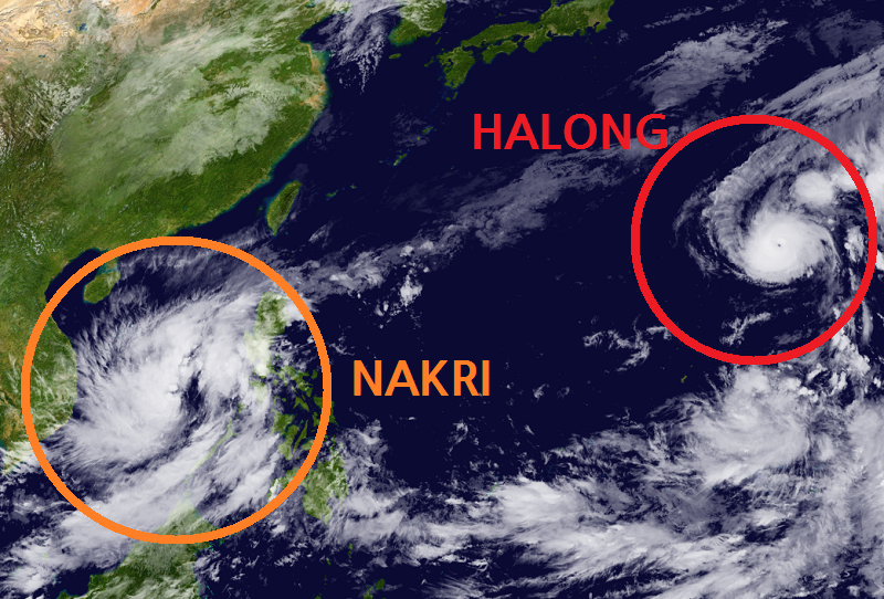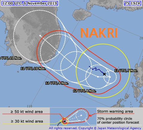 며칠 전의 예상과 그리 다르지 않게, 남중국해에서 열대요란 90W가 24호 태풍 나크리로 승격했고 동쪽 먼 바다의 23호 태풍 할롱은 빠르게 전향하면서 망망대해를 전전하고 있다. 나크리의 경로는 지난 태풍 '마트모'와 유사할 것으로 예측되므로, 베트남 중남부가 11월 9~11일 사이에 태풍의 직접적인 영향권에 들어갈 가능성이 높다.