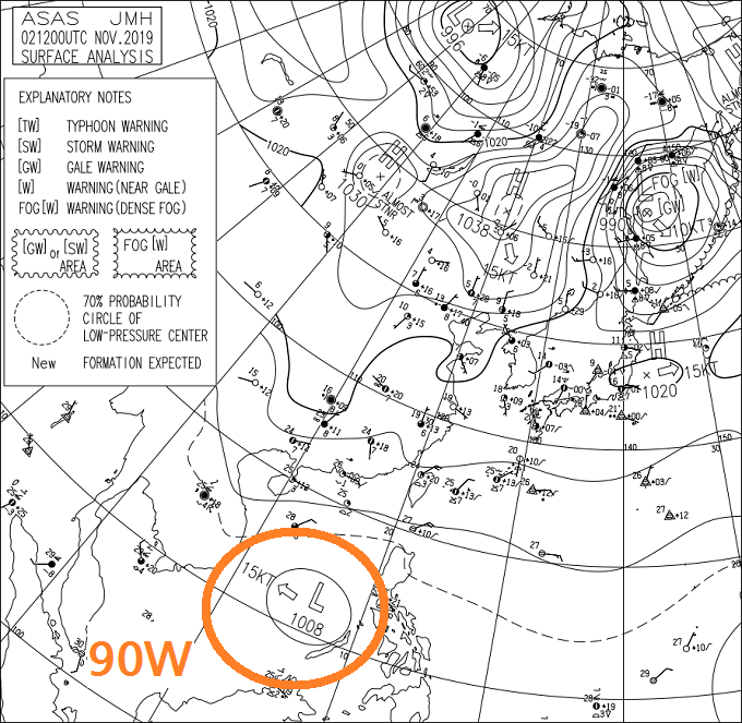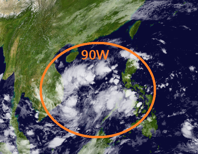 한편 남중국해에서는 태풍 할롱과 별개로 열대요란 90W가 활동 중이다. 일본 기상청의 지상 일기도에서는 1008hPa의 열대성 저압부(LPA)로 분석되었다. 90W의 위성 영상을 보면 당장의 조직 상태는 매우 부실하지만, 주변에 이렇다 할 지향류(指向流)가 없는 가운데 오랜 시간 필리핀 서쪽 고수온역에 자리 잡으면서 세력을 키울 것으로 보인다.