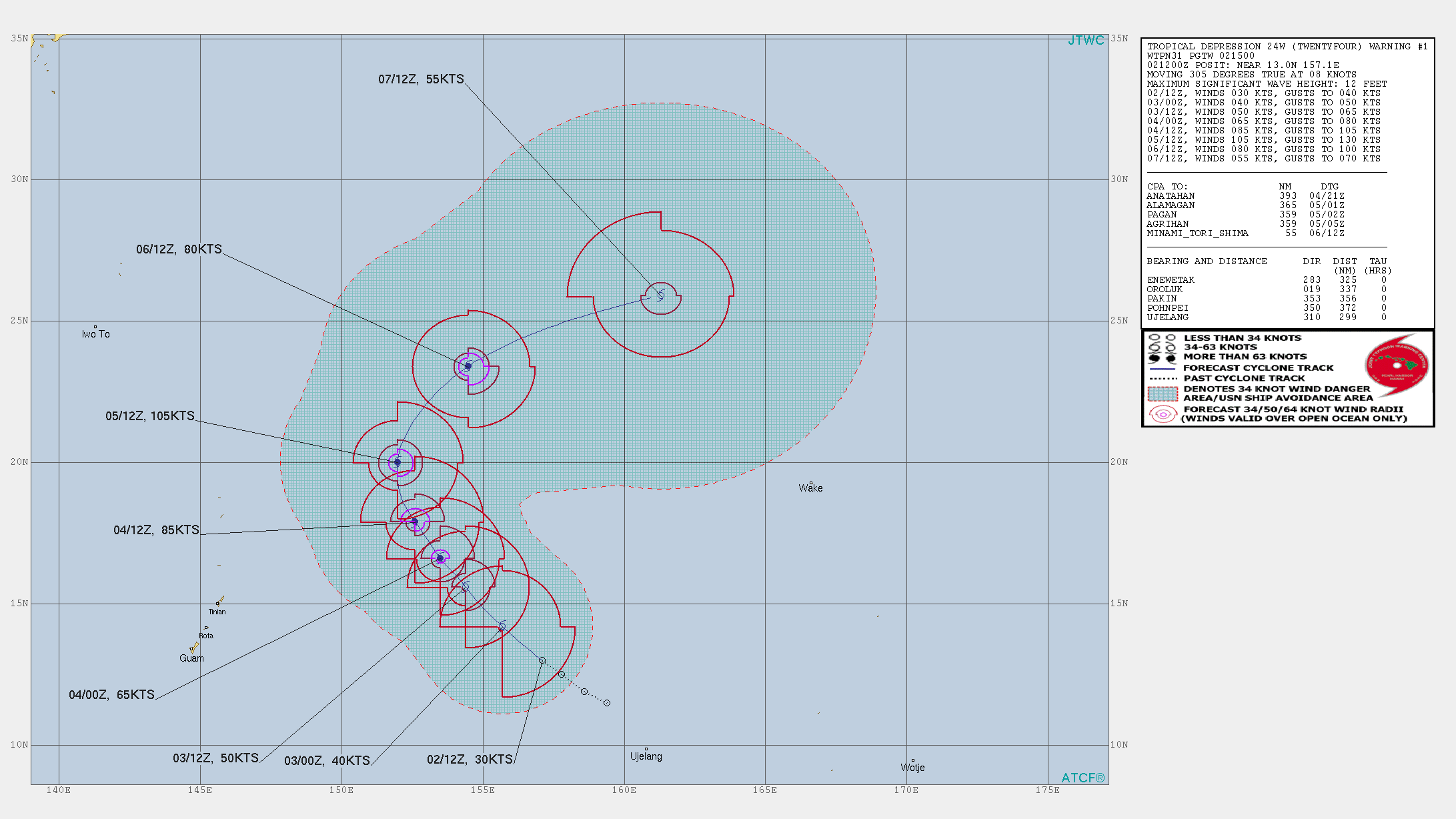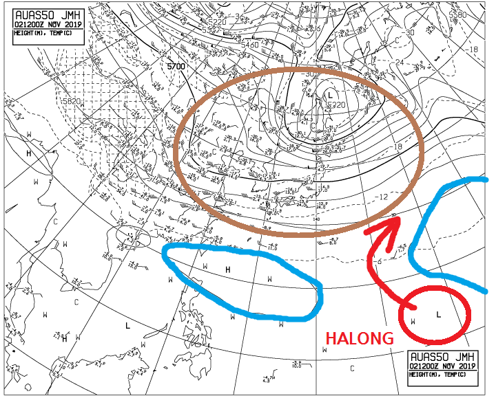 또한 미국 합동태풍경보센터는 23호 태풍 할롱(24W)에 대해 빠르게 북동쪽으로 전향하는 경로를 발표했다. 일본은 물론 괌이나 사이판 섬 등에도 영향을 주지 못하는 진로다. 앞서 북서태평양 500hPa 고도 일기도에서 보았다시피 11월로 접어들면서 아열대 고기압의 세력권이 동북아시아에서 멀리 떨어져 있고, 태풍의 전향을 늦출만한 요소는 존재하지 않는다.