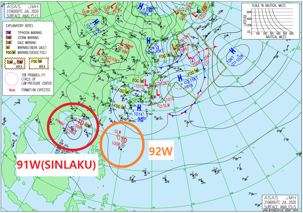 다만 최근 며칠 사이 북서태평양 기압계가 열대저기압 및 저위도 대류 활동에 조금씩 긍정적으로 변화하기 시작했으며, 두 개의 열대저기압(91W, 92W) 태동으로 이어졌다. 이중 91W에 대해서는, 태풍 명명권(命名權)을 가진 일본 기상청(JMA)으로부터 매우 오랜만에 태풍 발생이 예보되었다. 예상대로라면 3호 태풍 실라코(SINLAKU)가 8월 초 남중국해 중국 하이난 섬 앞바다에서 발생할 것으로 보인다.