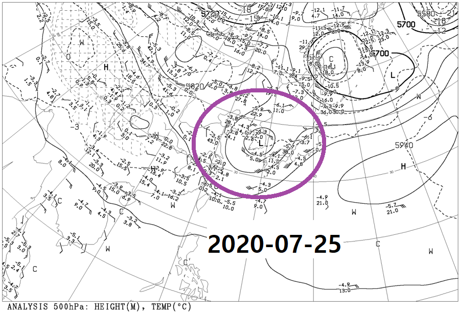 그런데 2020년 7월에는 왜 관측 사상 초유의 태풍 발생 '0개'를 기록했을까. 이는 다양한 원인이 복합적으로 작용한 결과지만 그중 가장 주요했던 것은 비정상적으로 남하했던 편서풍대와 이와 연계된 북쪽 한기였다. 남하한 한기는 북태평양 고기압(아열대 고기압) 북쪽 세력 확장을 저지했고, 대한민국의 기나긴 장마와 시원한 7월 등을 야기했다.