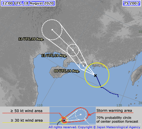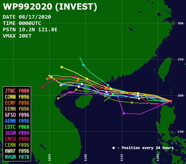 각국 주요 수치 모델의 예상 경로도를 보면 유럽 ECMWF / 미국 GFS 등 대부분의 멤버가 8월 19일부터 20일 사이 홍콩 남해상 통과 후 중국 광둥 성 서부(레이저우 반도 일대) 직격을 모의하고 있다. 보다 정확한 상륙 지점은 태풍의 발생이 공식 인정될 무렵에 정해질 것이다.