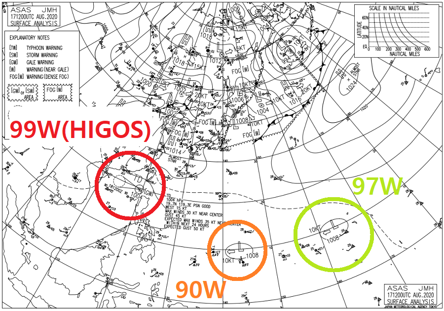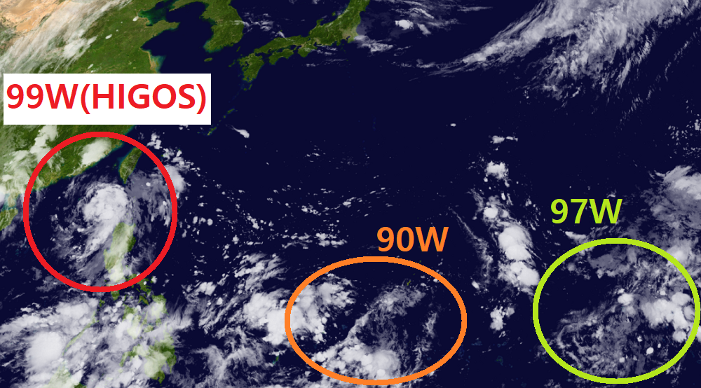한편 '태풍 히고스' 승격을 앞둔 99W 외에 태평양 동쪽 먼 바다에 위치한 두 개의 태풍 후보(90W, 97W)는 일단 잠재적인 '8호 태풍 바비(BAVI)' 후보로 분류되나, 당장의 조직 상태가 매우 부실한 데다 이렇다 할 발달 예측도 모의되지 않고 있다. 다만 갑작스레 발생했던 '6호 태풍 메칼라'의 사례를 보듯, 좀 더 시간을 두고 지켜볼 필요는 있을 것이다.