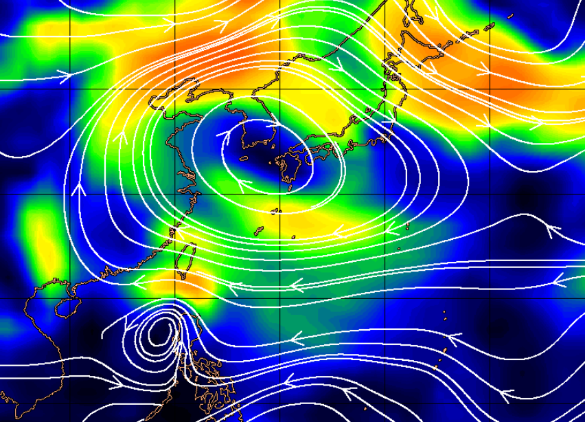CIMSS 분석 상층 유선도를 보면 북태평양 고기압(시계방향 기류)의 주력이 한반도 인근에 위치하며, 그 세력권은 서쪽으로 중국 내륙 깊숙이 이르고 있다. 제 7호 태풍 히고스는 고기압 가장자리의 서 지향류(指向流)를 타고 진행해, 중국 남부 하이난 섬~레이저우 반도~광둥 성 남서부 일대에 직·간접적인 영향을 줄 것으로 보인다.