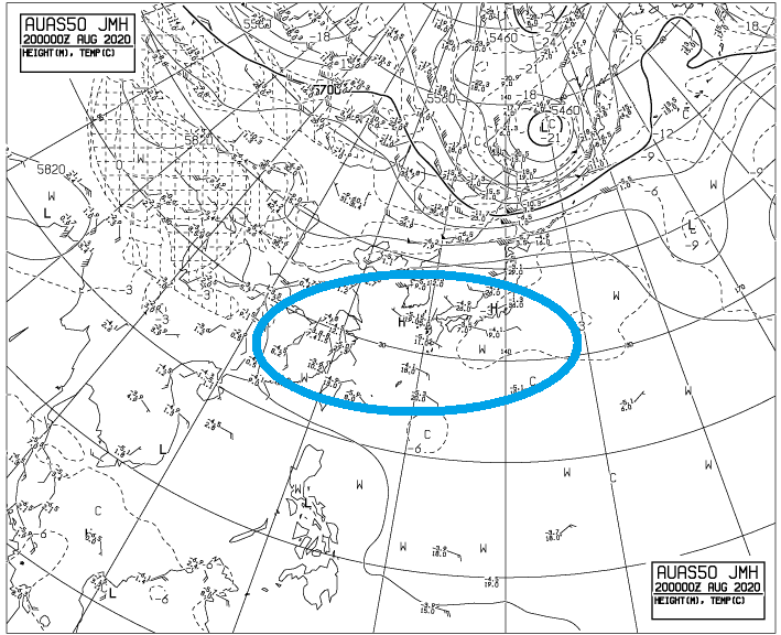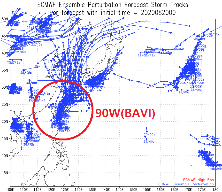 예비 8호 태풍 바비(90W)에 대해, 유럽 ECMWF 앙상블의 예상 경로도를 보면 대한민국 서해~남해안 직격부터 일본 큐슈에 이르는 다양한 진로가 모의되었음을 알 수 있다. 500hPa 일기도 분석에서는 북태평양 고기압(하늘색 원)이 동아시아 상공 기류를 지배하고 있지만 이는 점차 수축할 것으로 예측되며, 앙상블의 각 멤버별 엇갈림은 이때의 고기압 변동성에서 기인한다.