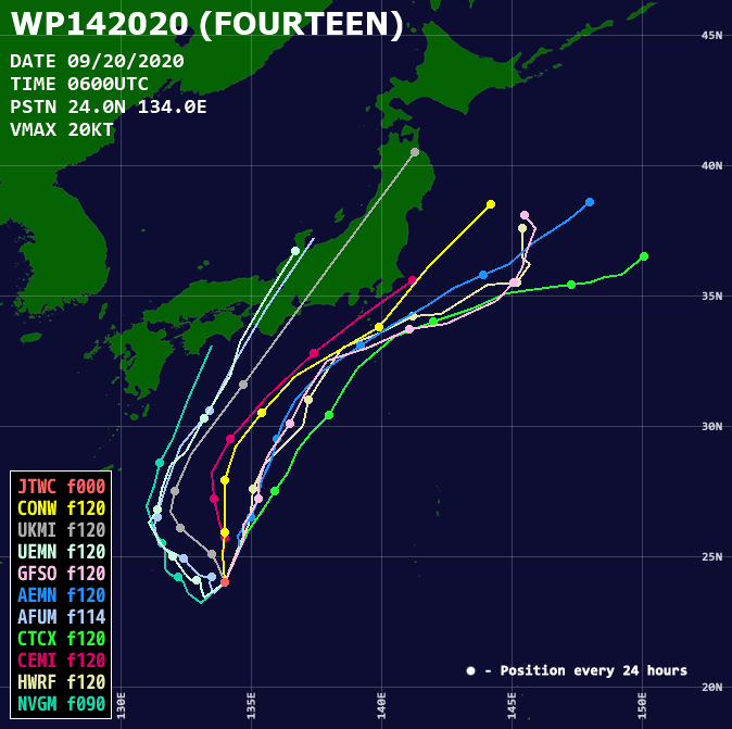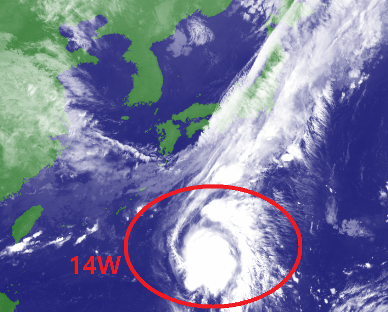 이 저기압은 당초 예측에서는 태풍으로 승격하기 이전에 온대저기압으로 변질될 가능성이 높았는데, 비교적 찬 공기를 동반한 중위도 상층 기압골이 때마침 꽤 낮은 위도까지 남하하고 있었기 때문이다. 지상일기도를 보아도 14W의 바로 북쪽으로 전선대(前線帶)의 모습을 확인할 수 있다.