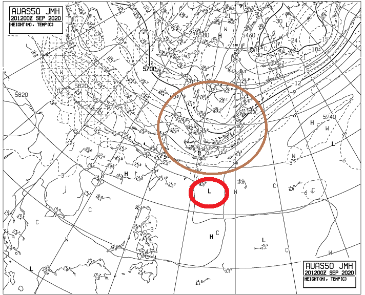 500hPa 일기도를 보면 전술한 중위도 기압골(갈색 원)이 북위 28도 부근까지 남하한 모습으로서, 예비 12호 태풍 돌핀(붉은색 원)은 기압골과의 본격적인 상호 작용이 머지않아 시작될 것이다. 이는 돌핀의 온대저기압화(化)가 진행됨을 의미한다. 또한 태풍은 해당 기압골의 지향류에 이끌려 북동진할 것으로 예상된다.