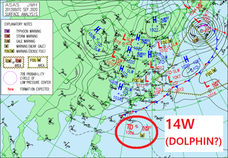 북서태평양 태풍의 명명(命名)을 담당하는 일본 기상청(JMA)은 아직 14W를 열대성 폭풍(태풍)이 아닌 '열대저기압'으로 분류하고 있지만, 최근의 발달 추세가 조금 더 지속된다면 오늘 중 공식 12번째 태풍이 발생할 전망이다. 12호 태풍의 이름으로 예정된 '돌핀'은 홍콩에서 제출했으며, 홍콩 근해에 서식하는 흰돌고래에서 유래했다.