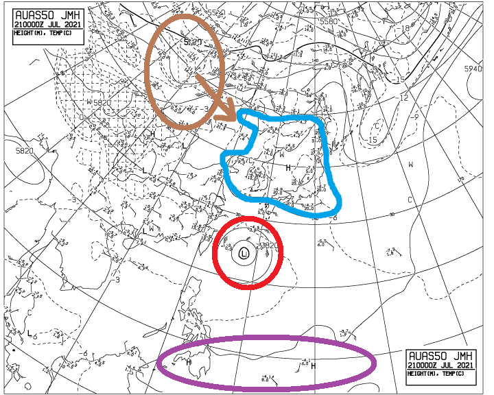 이번 주 후반 몽골 부근에서 남하하는 상층 기압골(갈색 원)이 한반도 상공의 아열대 고기압 세력권을 축소시킬 것으로 예측되는 가운데, 일시적으로 태풍의 북상 성분이 강화될 전망이다. 태풍 인파에 대한 각국 수치 모델의 진로 차이는 이때의 기압계 변화를 다르게 예측하는 데서 기인하며, 인파의 목적지가 어디가 될 것인지는 며칠 더 지켜보아야 한다.