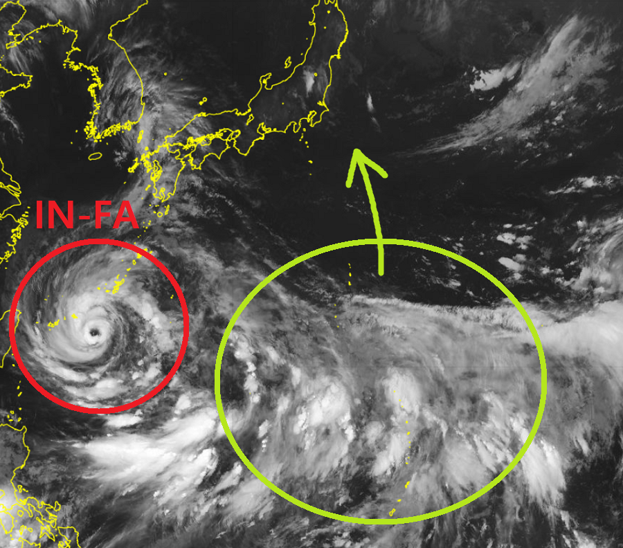 발생 4일째를 맞는 6호 태풍 인파(IN-FA)는, 개선되는 상층 환경과 30도 이상의 고수온역 등의 조건이 한데 어우러짐에 따라 강력 태풍의 형태를 갖추기 시작했다. 위성 영상을 보면 '눈 구조'와 함께 제법 두꺼운 대류역이 균형적으로 자리 잡은 모습이다.